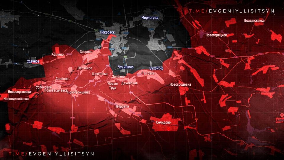 Активные бои в Удачном, районе Леонтовичей и Троянды, по позициям врага работает артиллерия и дроны. На северном охвате фронт стабилизировался: ВСУ подтянули резервы и усилили контратаки, наши укрепились на занятых позициях. Отмечается, что прорыв был проведён силами батальона спецназа малыми группами. Наши держат периметр Золотого Колодезя и ведут работу по трассе на Краматорск и Доброполье. Есть сообщения о боях на окраинах Владимировки и Шахово.