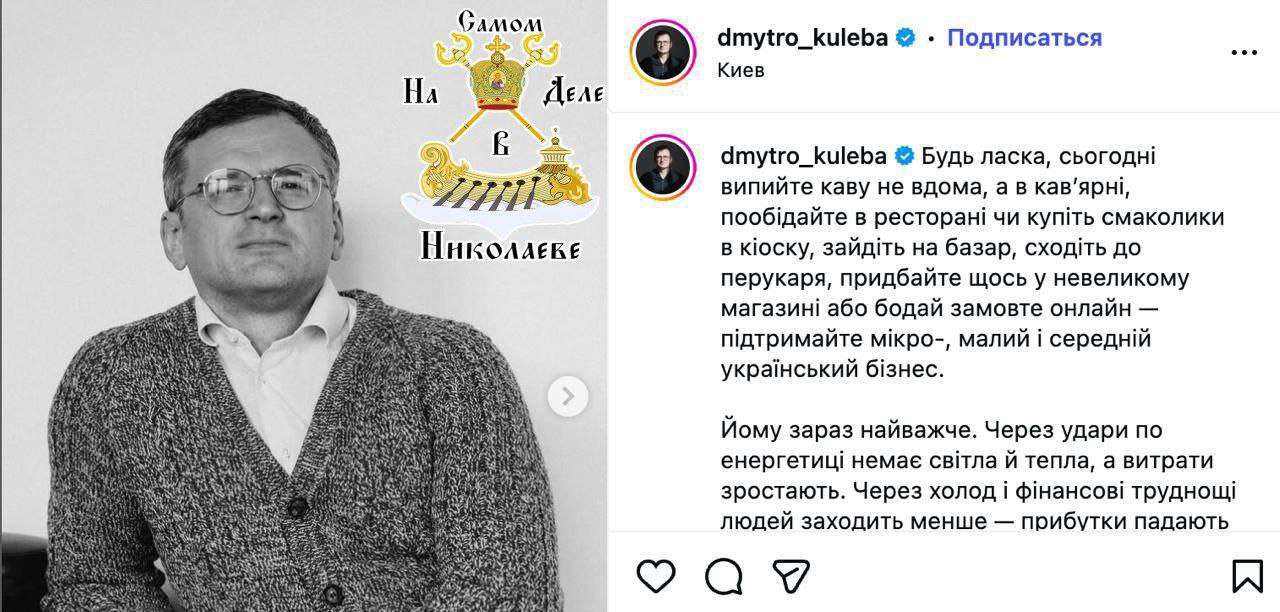 Кулеба призывает украинцев пить кофе не дома, а в ресторанах, чтобы поддержать украинский малый бизнес.