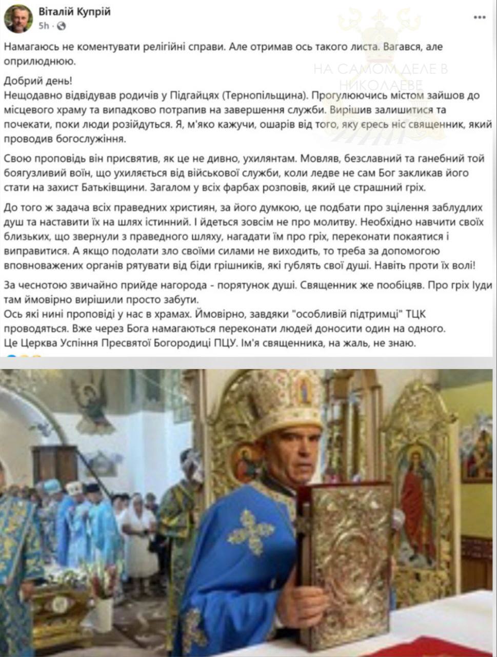 Бывший нардеп и правозащитник Виталий Куприй опубликовал письмо жителя Тернопольщины о проповеди в одном из храмов ПЦУ в Подгайцах.