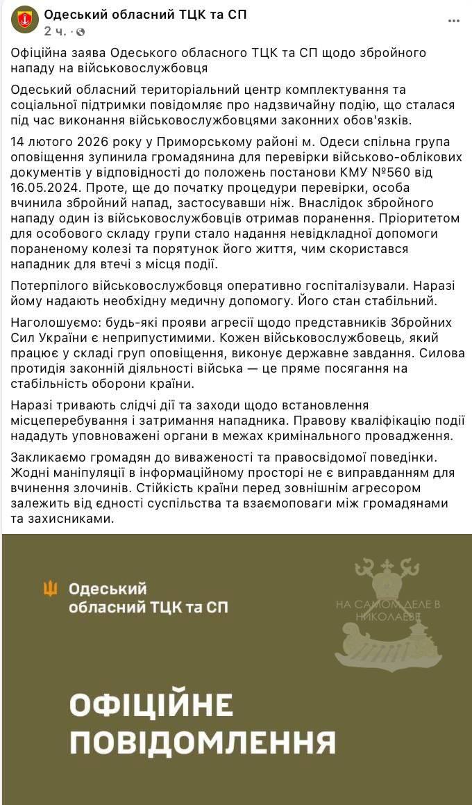 Вчера в Приморском районе Одессы мужчина не стал дожидаться пока его начнут паковать. При попытке проверить у него документы, как утверждает областной военкомат, одессит достал нож и ударил одного из людоловов.