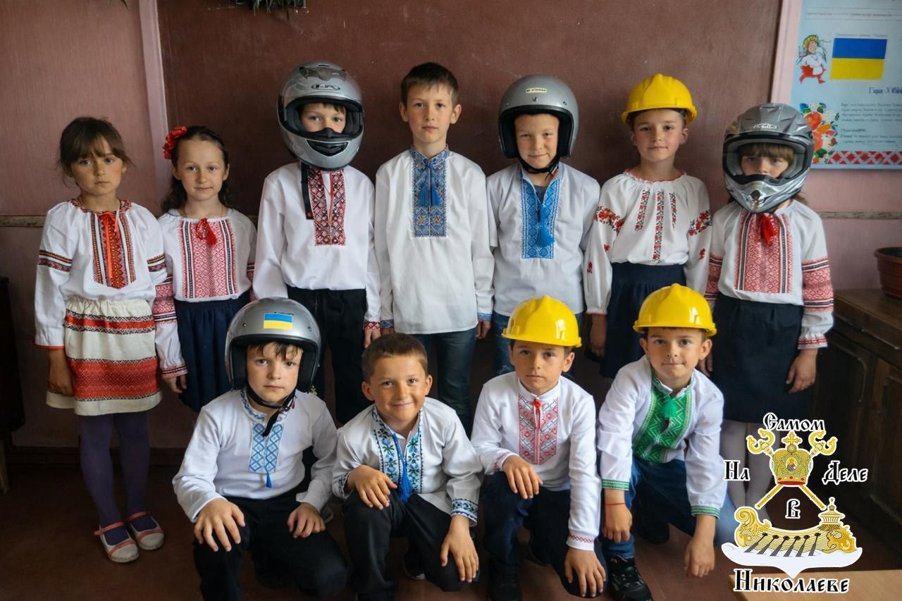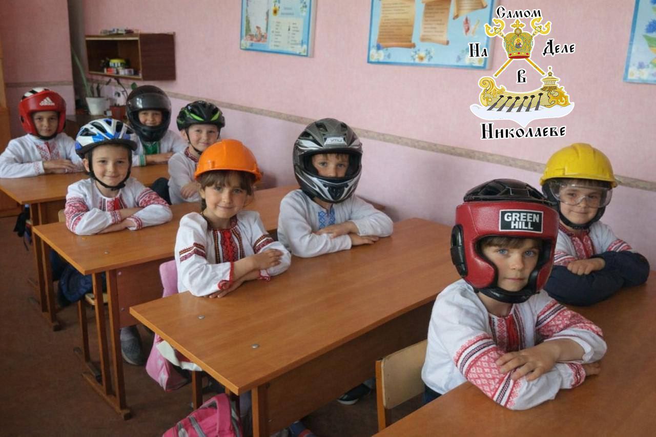 Детей обязали прийти и просидеть целый день в вышиванках и «патриотычных» шлемах. Сменили кастрюли на шлемы…