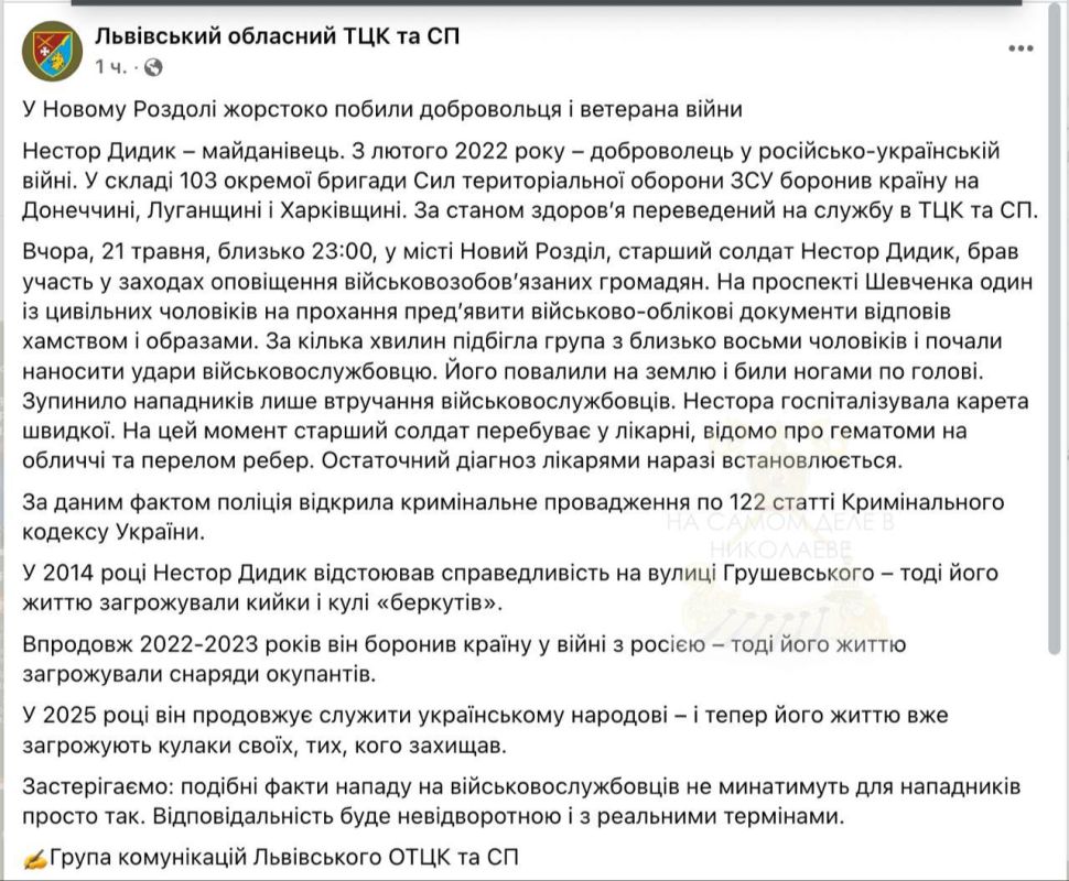 Львовский областной ТЦК сообщает об избиении своего сотрудника в Новом Роздоле Львовской области.
