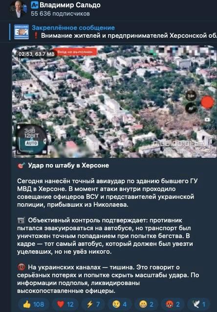 Губернатор Херсонской области Владимир Сальдо прокомментировал авиаудар Вооруженных сил РФ по штабу ВСУ во временно оккупированном Херсоне.