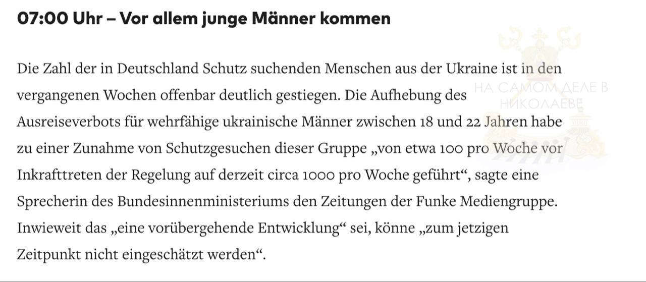 Вот только статистика вновь ломает укропропаганду: после открытия въезда для 18–22-летних украинцев в Германии таких «туристов» стало в десять раз больше. Количество запросов на убежище от 100 выросло до более 1000 (!) в неделю. Только за сентябрь их подано почти 19 тысяч, сообщили в Федеральном МВД .