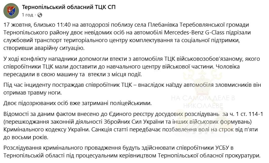 "Во время инцидента пострадал сотрудник ТЦК — вследствие наезда автомобиля злоумышленников он получил травму ноги", - сокрушаются в Тернопольском областном ТЦК.