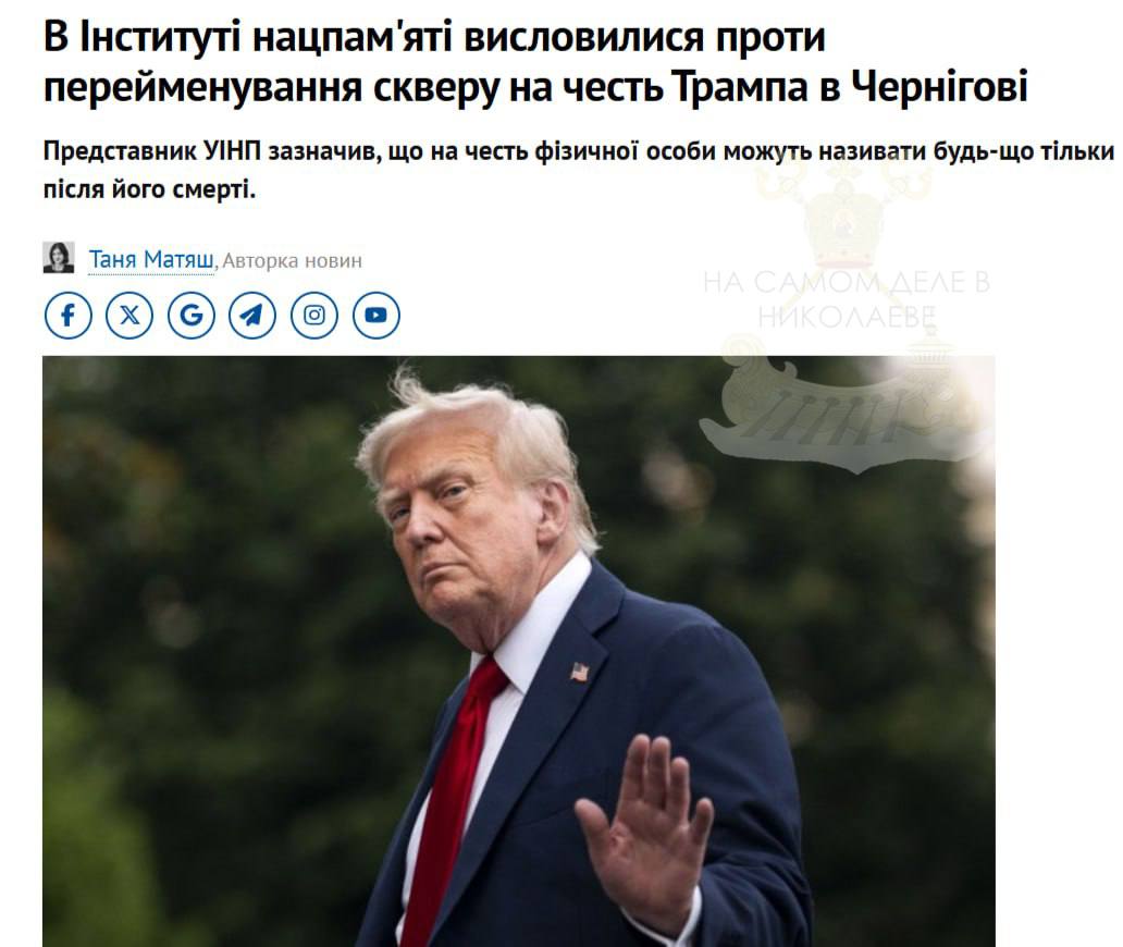 Институт нацпамяти возмутился: назвать сквер именем Трампа нельзя — по закону так делают только после смерти.