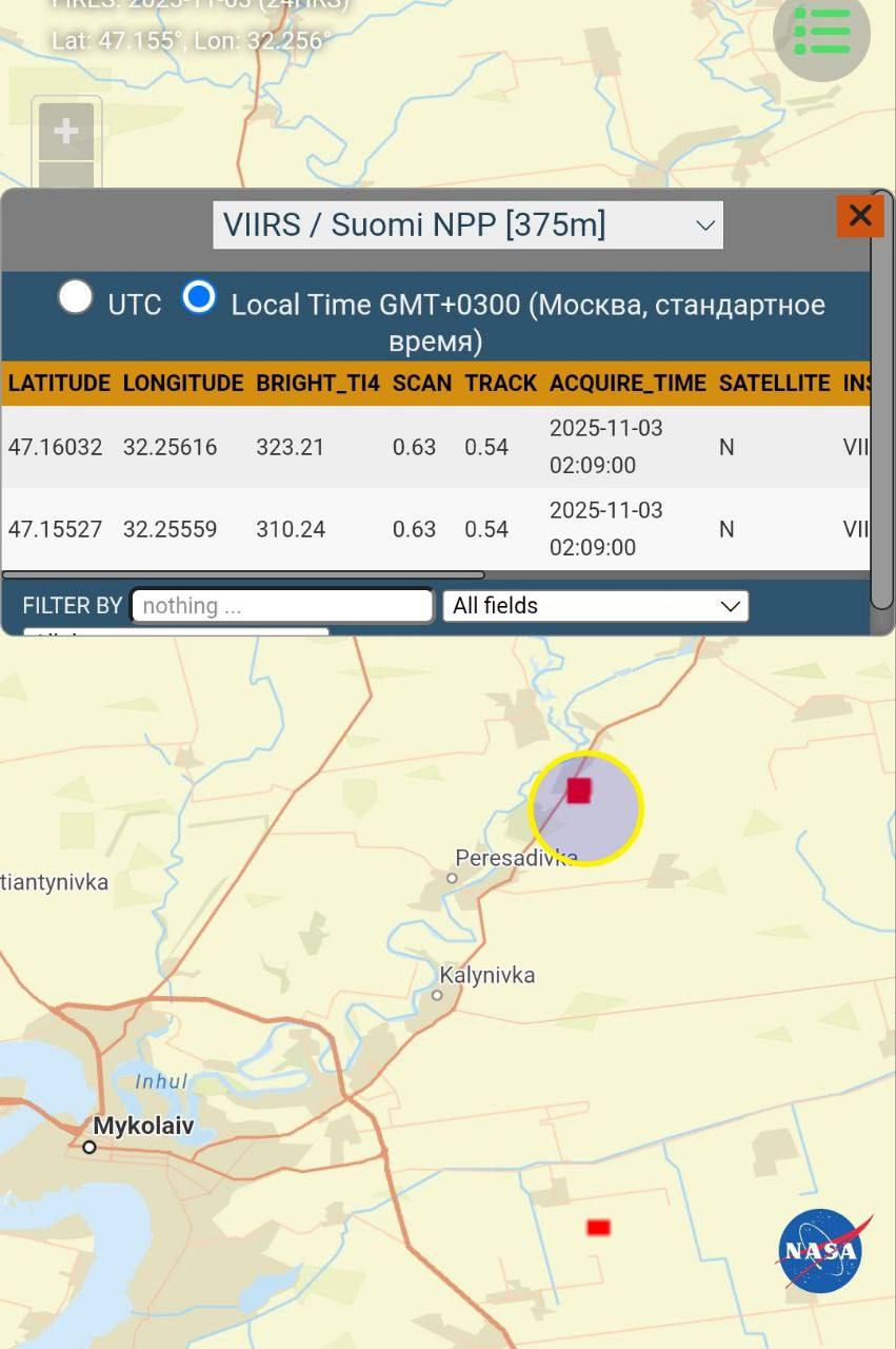 Сервис FIRMS показывает тепловые метки в районе газокомпрессорной станции "Марьевка" Николаевской области.