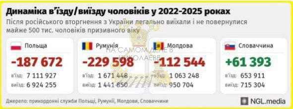 По информации, опирающейся на данные пограничных служб Словакии, Польши, Румынии и Молдавии, минимум 470 тысяч украинских мужчин законно покинули страну с начала военных действий и не вернулись назад. Данные по Венгрии отсутствуют.