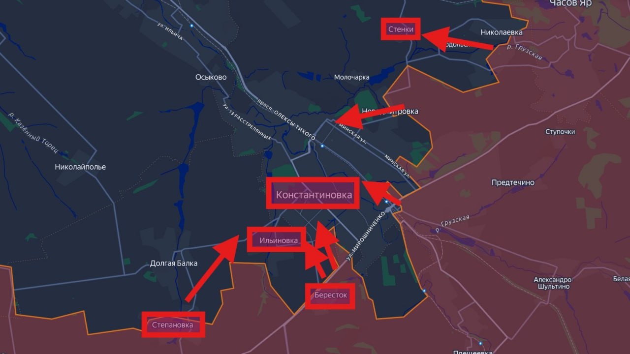 Зажимаем Константиновку с трёх сторон. Штурмовики работают с юга, от Иванополья, с запада — от Ильиновки, и с востока, в районе вокзала. Группировка «Юг» отработала по врагу в Ижевке и Стенках. Бандеровцы пытаются копировать нашу тактику, но мы на их выпады отвечаем жёстко — строим оборону, которая держит штурмовиков и гасит огневые точки. Арта и дроны режут вражескую группировку на куски, выкуривая с позиций.