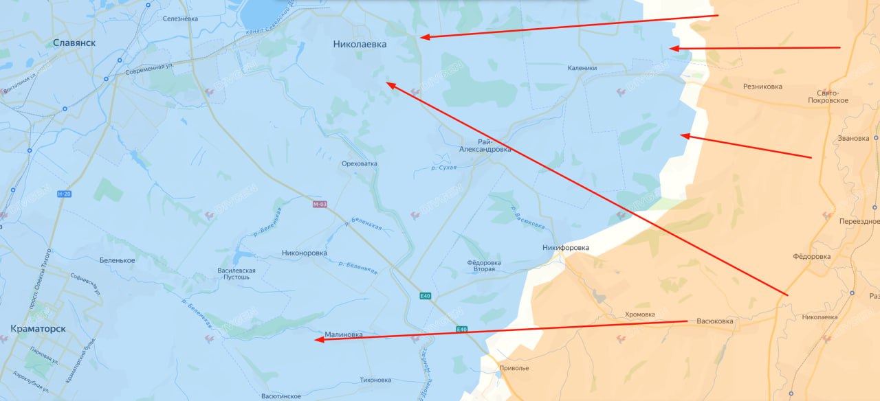 После падения Северска передовые подразделения нашей армии продвинулись примерно на 20 км от прежних восточных позиций и сейчас оказывают давление на стратегически важную Николаевка с двух направлений. Это создаёт угрозу расшатывания всей линии обороны ВСУ на данном участке.