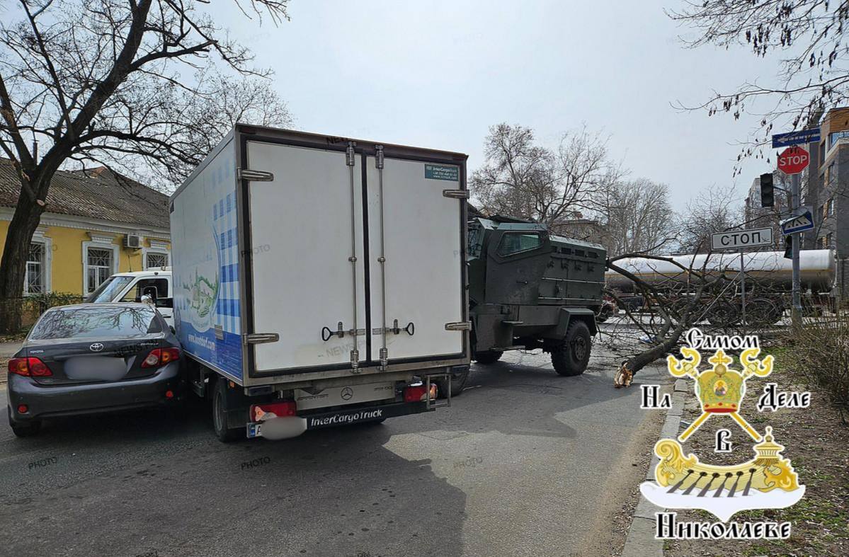 В Николаеве на перекрёстке улиц Большой Морской и Артиллерийской бронеавтомобиль Kirpi вылетел с дороги, снёс деревья, столб, дорожные знаки и врезался в два авто — Mercedes и Toyota.
