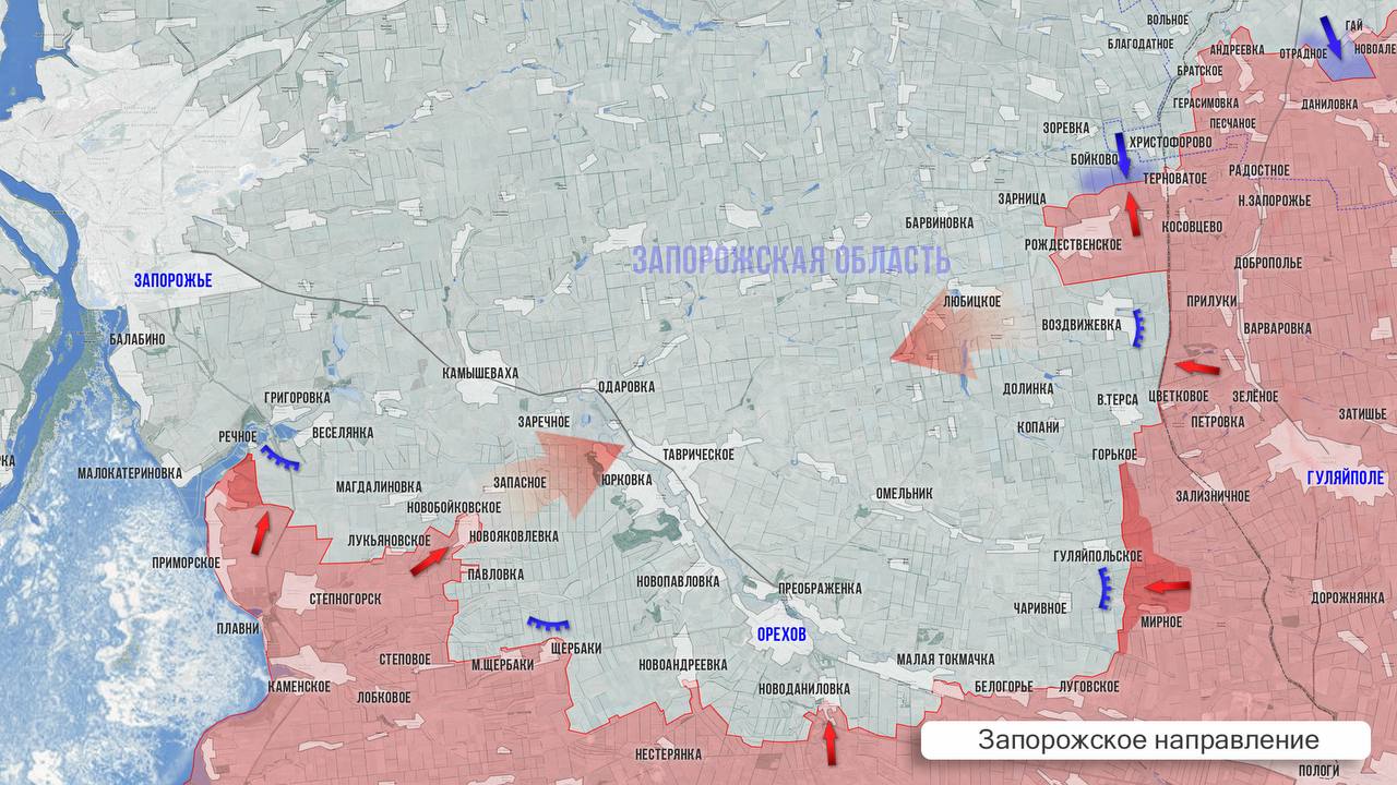 На Запорожском участке ВС РФ ведут бои за опорники в районе Гуляйпольского, Верхней Терсы и Воздвижевки. Они стараются вклиниться в оборону ВСУ между Воздвижевкой и Верхней Терсой, продвигаясь в сторону Ровного. Российские операторы дронов наносят удары по технике противника в Любицком и скоплениям ВСУ в ближнем тылу.