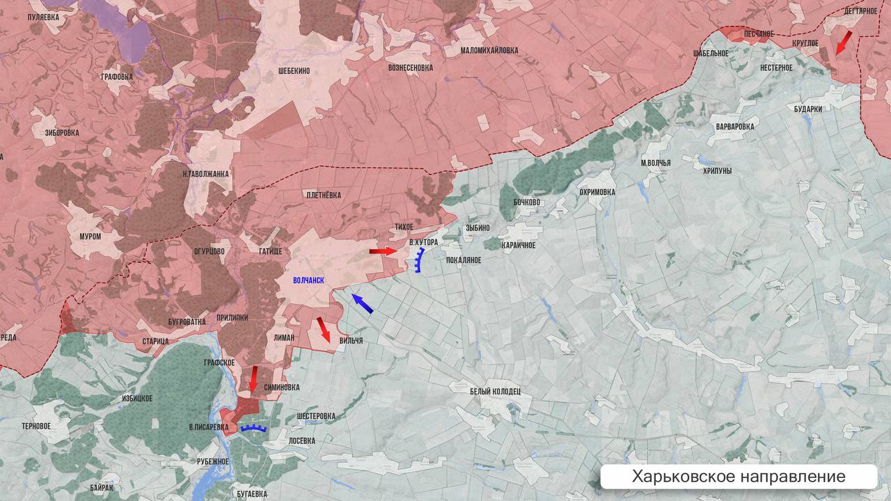 На Харьковском участке ВС РФ ведут зачистку лесов в треугольнике между Графским, Симиновкой и Верхней Писаревкой. В районе Избицкого и Волчанских Хуторов наши войска работают по опорникам и ПВД ВСУ.