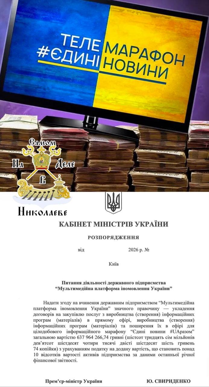 Сегодня Кабинет Министров выделит еще 638 млн грн на содержание украинского телемарафона «Единые новости», сообщает нардеп Железняк.