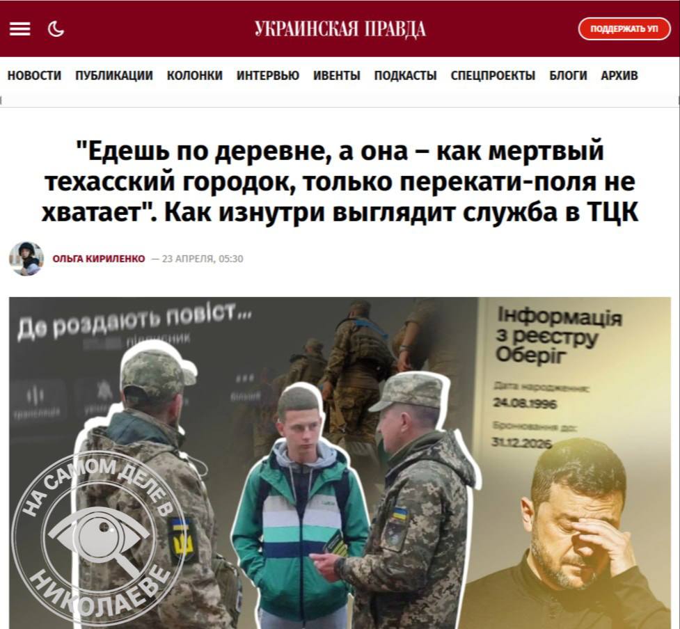 В публикации всё это подаётся как трагедия «бедных ТЦКшников», которые якобы действуют по закону, а всё, что выходит за его рамки — давление коррумпированного руководства.