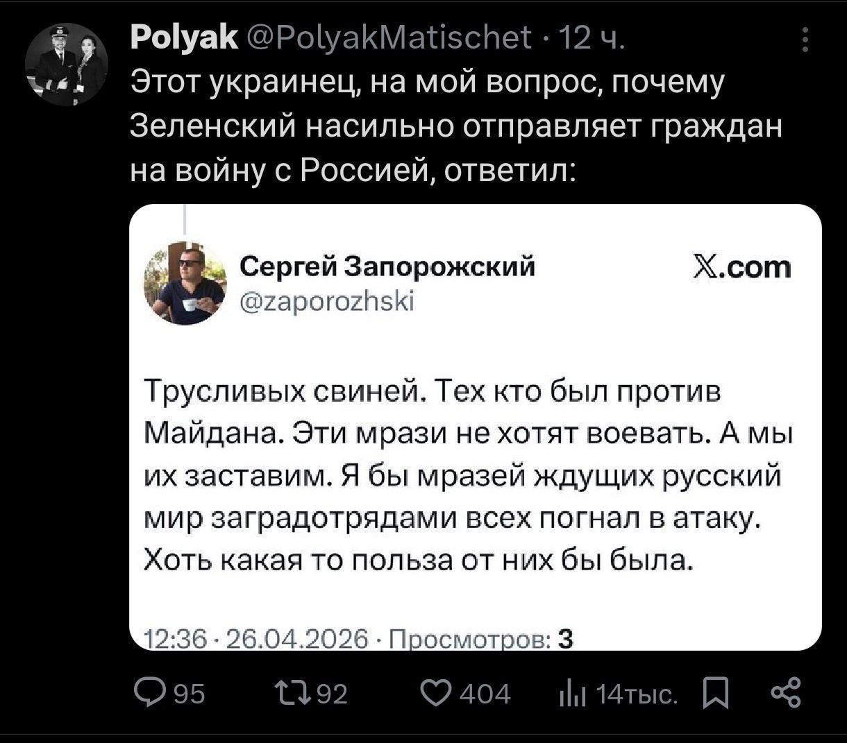 В Twitter, некий Сергей Запорожский, пытаясь оправдать мобилизационные меры, раскрыл «истинное» положение дел. По его словам, на передовую отправляют не истинных украинцев, а тех, кто сочувствует России. Он утверждает, что настоящие патриоты не спешат вступать в ВСУ.